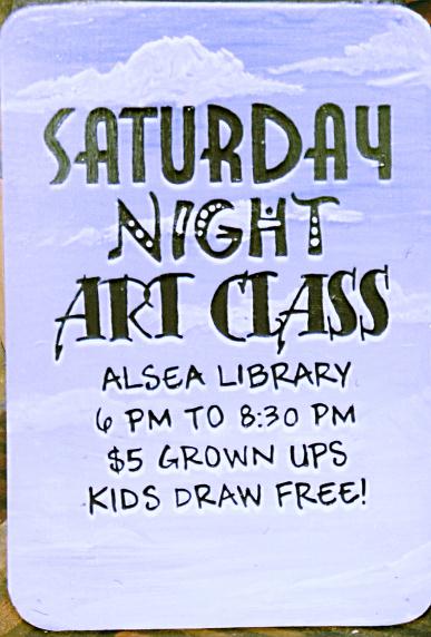 Art Class This fun cloud sign was used to advertise the Saturday Night Art Class Dan and Mae held at the library in Alsea. |