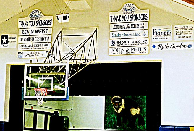 Alsea School Sponsor Signs We chose to use the school colors, blue and white, on all the sponsor signs. It gives a unified look in the gymnasium. To date we have painted 18 Alsea School signs. |