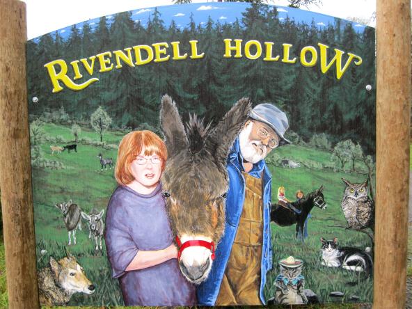 Rivendale Hollow This painting is a great example of our art signs with Linda and Wayne hugging their donkey in the middle of their goats, alpacas, cats, dog and owl. All are nested in the lush Oregon landscape at their home between Philomath and Alsea. |
