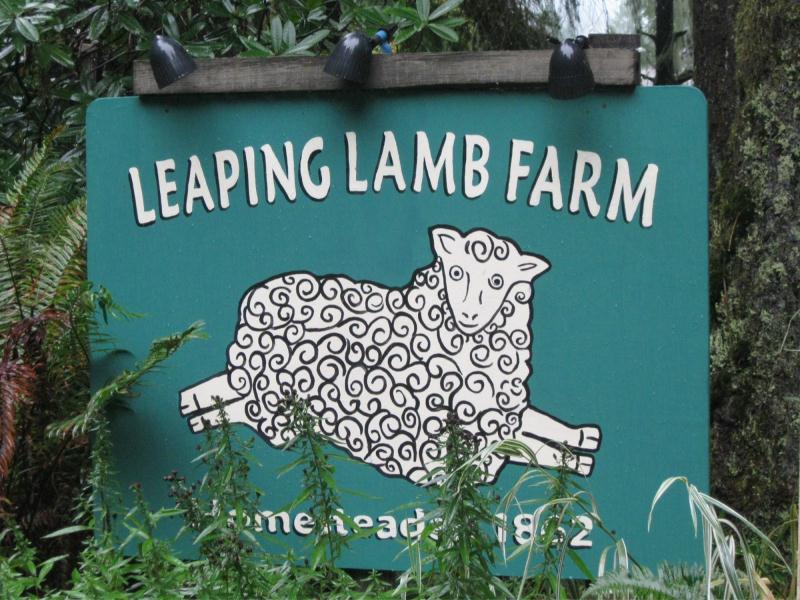 Leaping Lamb Farm Stay - road sign Leaping Lamb Farm Stay is a working farm and Bed and Breakfast located just East of Alsea on Honey Grove road. It was built by the Spencer family between 1896 and 1930 as part of their original homestead. Guests stay in private cabins in the spectacular Alsea Valley and can help with farm life. Their sign features their beautiful old barn and friendly sheep. |