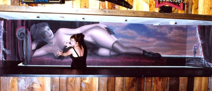 Marissa over the Bar Marissa is seen here with the mural of herself in Cowboys Club in Texas. |