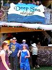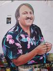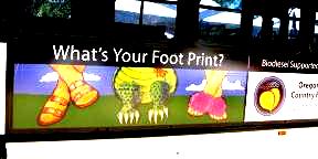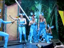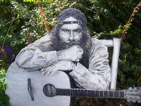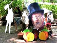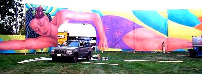 In the spring of 1991 we encountered Reverend Chumleigh performing in Mt. Vernon, Washington for the annual Tulip Festival. He fed us his favorite North west salmon, took us to some of the beautiful hot springs in Washington, and introduced us to the Oregon Country Fair. 1991 was the final year Moz Wright headed Entertainment Camp. Cory Sullivan took over coordination of Entertainment the next year and we became fair volunteers helping her. Our first project with her was to create Blue Moon Stage in 1992. Since then we have painted Shady Grove Stage, Gypsy Stage, Main Stage, Hoarse Chorale, have paintings on Daredevil and W.C. Fields vaudeville stages, Child Care, Whitebirds emergency path scrim, Peachy the Dragons lair, numerous signs, some people, and in 2009 built and painted the grand Giant Peach Gate entrance to the Fair.