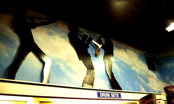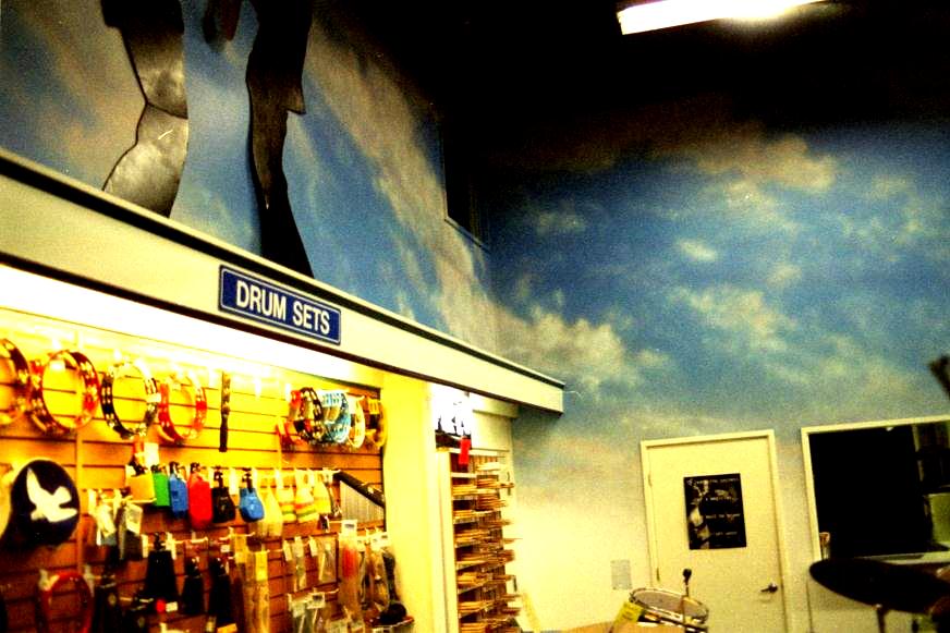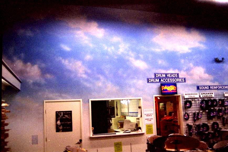 Lights Music Longtime owner, Jonathan Lights, decided to relocate his music store from downtown Eugene, where he provides schools with instruments for their bands and every other type of musical equipment, to the old Fox television studio building on Good Pasture Island Road by Valley River Center. It was the perfect location to house the expanding business. Having 20 ceilings in the building allowed plenty of space to paint a cloud mural on three walls of the main room. This created a feeling that the space was wide open. |