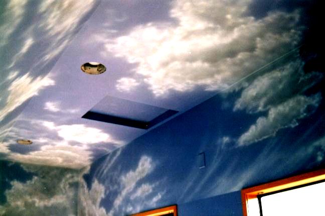 First contact us by email or phone and we will find out a few basics like where, what and when. If you are long distance, email us a photo of your environment and some information about the space where you would like the mural. We can then evaluate how best to proceed with a design. If you need help with a design or ideas for your mural, we are happy to offer many possibilities. Our design phase is included in the price of the mural. For a basic design that we do not paint we charge $150. With a design agreed upon, we will estimate what is required to access the place where the mural will go and how long it will take to complete. Frequently with cloud paintings on a ceiling, we can show you a photo from our large collection of samples and we are ready to paint!