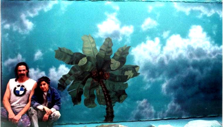 Sky with Palms Every building has a ceiling, but imagine stepping off the elevator in the hotel you are visiting and looking up and seeing this beautiful Caribbean Sea colored sky with a palm tree floating over your head. Some people may be surprised to find that we can paint a mural on canvas and that painting can be installed on almost any surface, walls or ceilings, with quality wallpaper glues and then actually move the painting at a later date with no damage to the surfaces or the painting! |