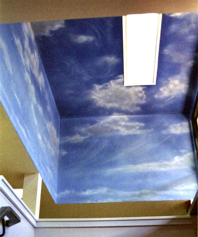First contact us by email or phone and we will find out a few basics like where, what and when. If you are long distance, email us a photo of your environment and some information about the space where you would like the mural. We can then evaluate how best to proceed with a design. If you need help with a design or ideas for your mural, we are happy to offer many possibilities. Our design phase is included in the price of the mural. For a basic design that we do not paint we charge $150. With a design agreed upon, we will estimate what is required to access the place where the mural will go and how long it will take to complete. Frequently with cloud paintings on a ceiling, we can show you a photo from our large collection of samples and we are ready to paint!