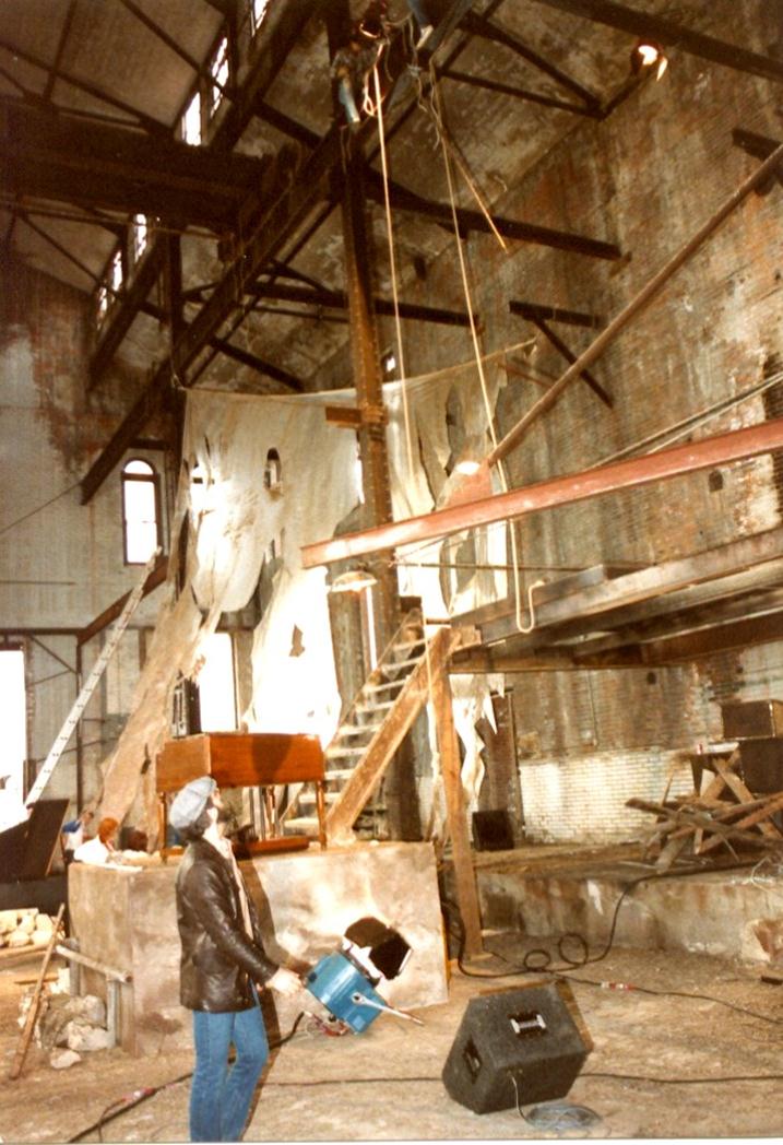 Thats All set Phil Collins The set for Phil Collins Thats All music video was in the old electric power plant near downtown Dallas, Texas. A director for Capitol records lead us through hanging several 10 x 45 pieces of plastic and painting them to match the already nasty pigeon poop covered floor and walls. When the stage was built for Phils piano, it looked too new so we sprayed it with dark paint and scooped up poop from the foot deep piles on the floor and threw it all over the new set. A moment of total NON glamour! |
