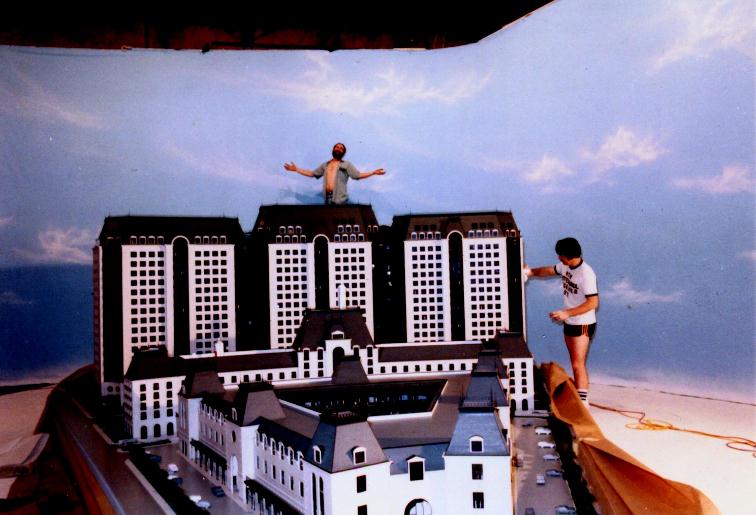 Crescent Model Backing with Mike The Crescent Hotel built this huge model prior to constructing the actual building and required our expertise to give the model a realistic sky background during presentation to the collaborators. The cloud painting was hung in a large semi circle that was 18 feet tall and ran approximately 70 feet in length. Thats our friend Mike on the ladder. |