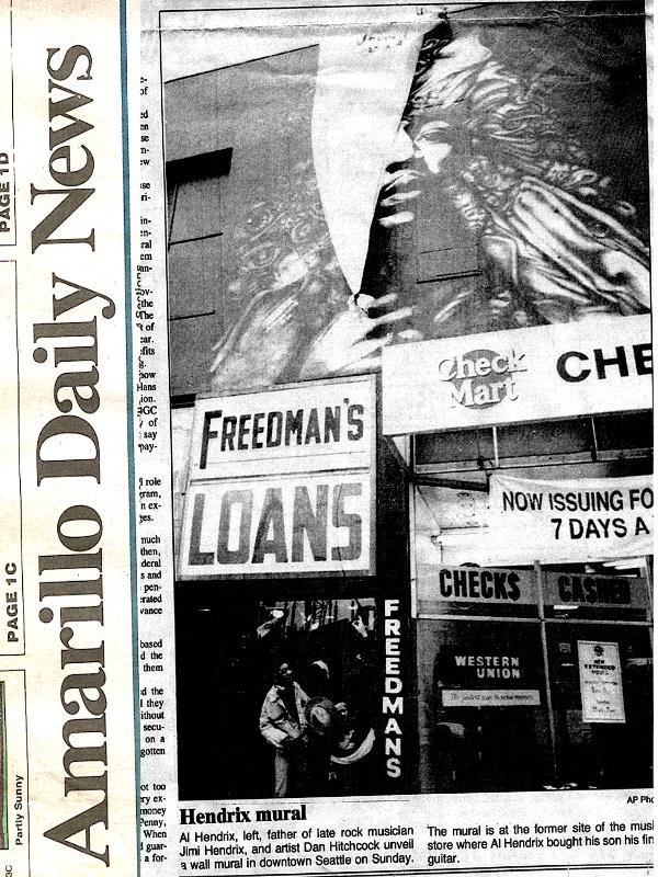 Al Hendrix, left, father of late rock musician, Jimi Hendrix, and artist Dan Hitchcock unveil a wall mural in downtown Seattle on Sunday. The mural is the former site of the music store where Al Hendrix bought his sons his first guitar. |