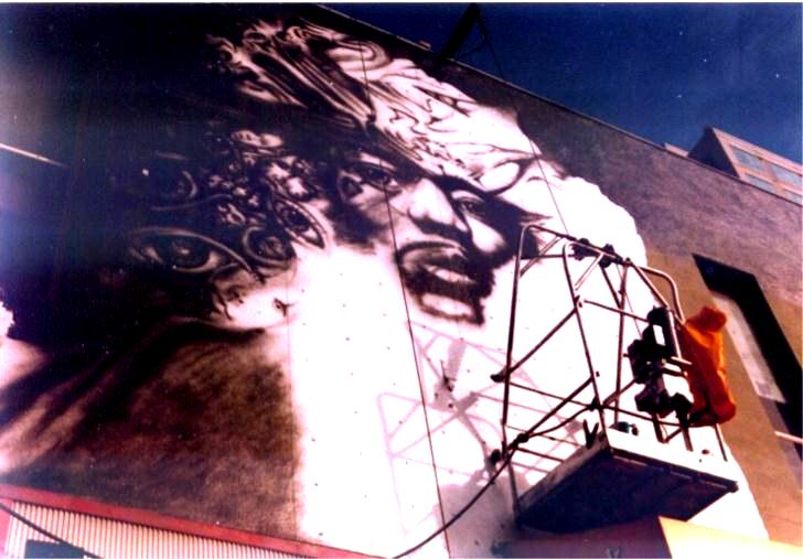 Jimi Hendrix Memorial MuralIn progress. It took 21 days to paint the mural and because it was so cold, we had to wait until noon each day for the sun to pass the tall buildings and get us out of shade and warm up the wall. |