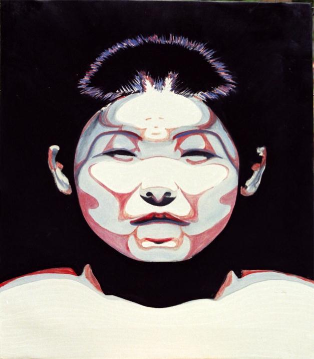 Kazumi 1 oil on canvas 24 inches by 36 inches available $1250 This painting shows how I like to use the computer to enhance or college photos, then paint from that photo. This piece is constructed with 2 right sides of Kazumis face so both sides are exactly the same. Check out Kazumi 2, it is a mirrored face like this one. |