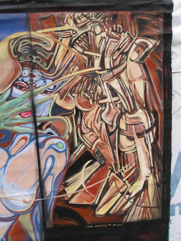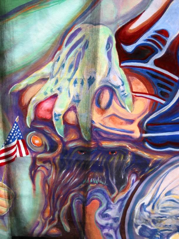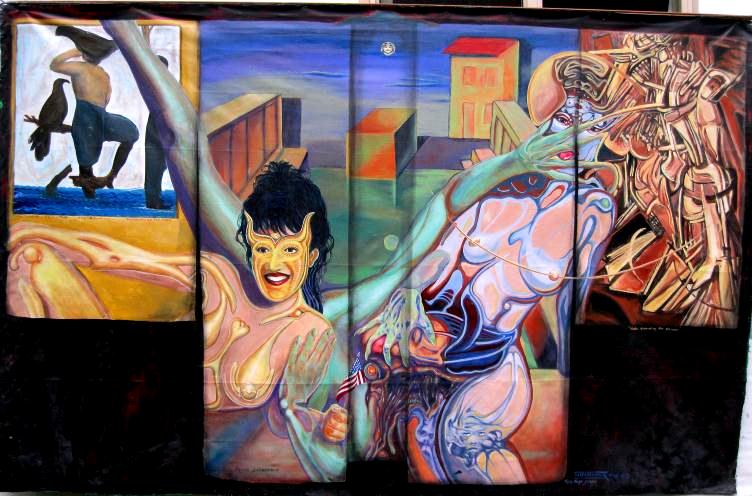 Taks Naga Jubon acrylic on canvas 48 inches by 82 inches available $2000 Tak told me a Naga Jubon is a short sleeved kimono which is what this painting represents. The theme is a spoof of the Dada painters period like Max Ernsts physiomythological flood picture and Aquis Submersus , and Nude descending staircase, so the girls are just making fun of all that seriousness. I think I wouldnt mind having a robe with this painting on it. |